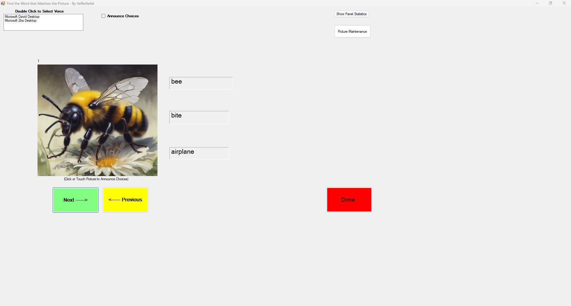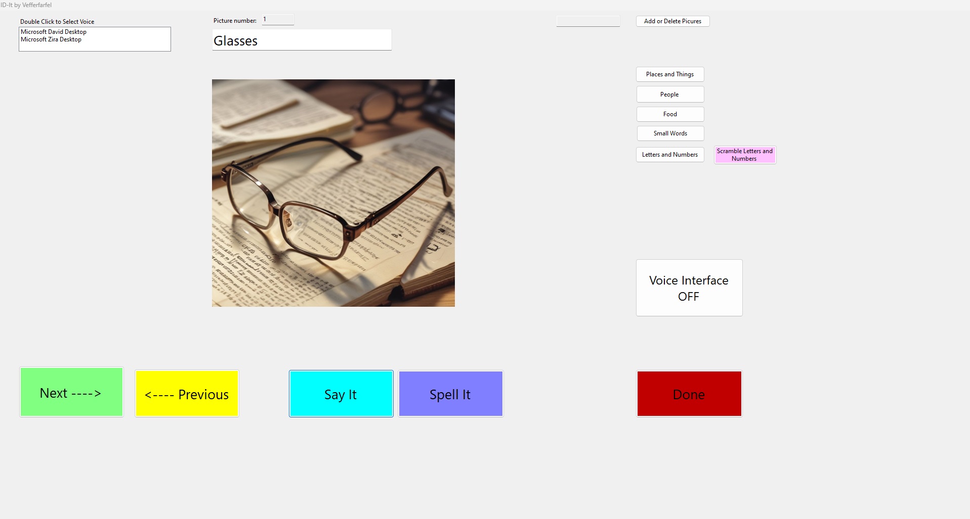 The ID-It program allows the user to import photo files of places and things, people and food items for identification. It will present the alphabet and letters and numbers (0-9) either in order or randomized and present small words (such as out, but, in, etc.). A voice interface is included for those not able to use the command buttons. Photo files are imported from a cell phone (or other sources) as long as they are in .jpg format. Small words can be added or removed using the maintenance program.