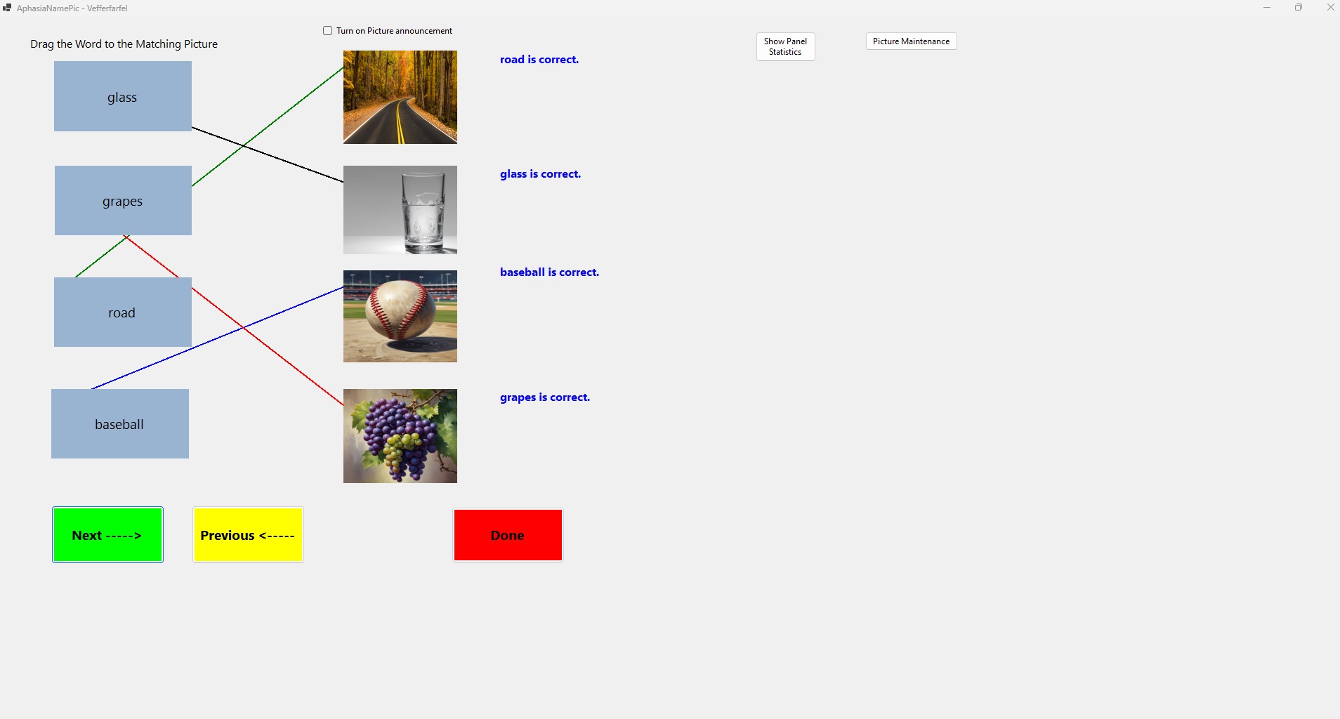 The Aphasia Build Sentences program presents a picture or series of pictures (upto 4) that are described by the words in a simple sentence. Each word can be annouced by the computer by clicking it or if the computer is equipped with a touch screen by touching the word. Optionally the whole sentence can be annouced by the computer. Additional photo/picture files (.jpg format) and sentences can be added using the maintenance program.
