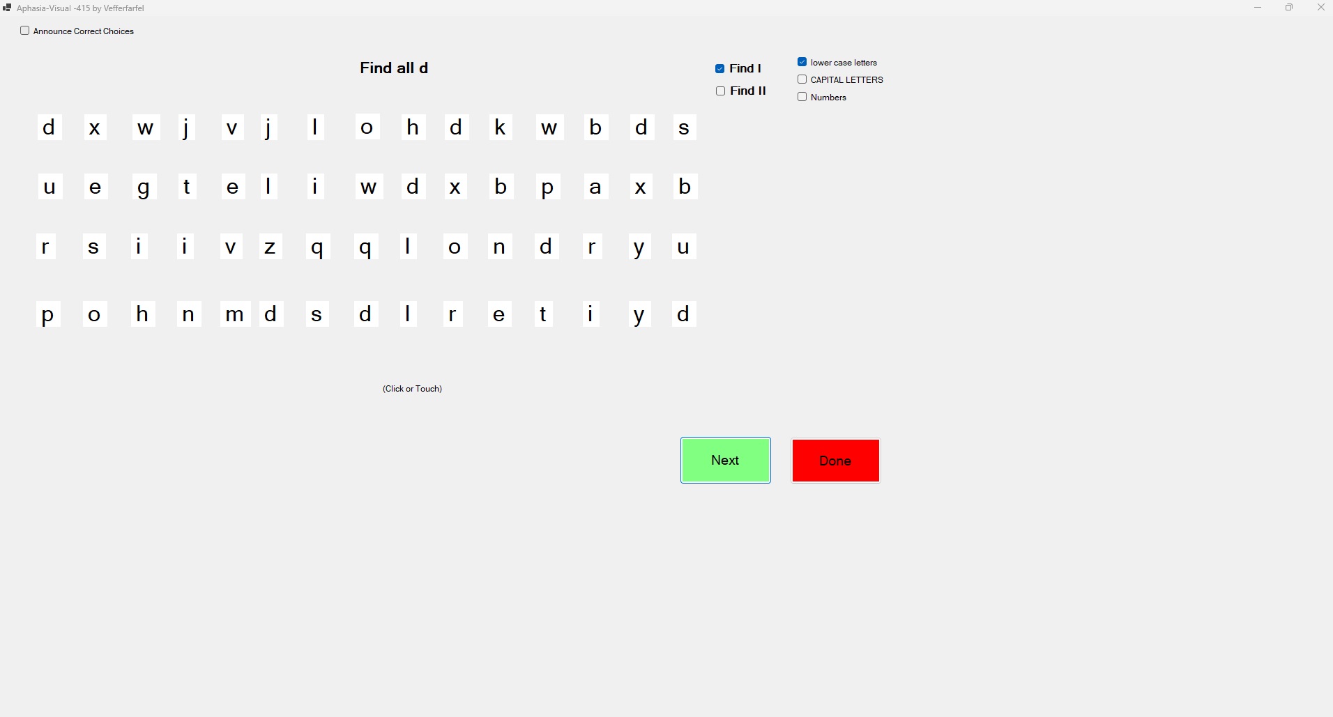 The Aphasia Visual Scanning program has been designed to promote searching for and identifying letters and numbers in a field of 60 characters in 4 rows of 15 characters each in a left to right direction. It will generate a new field (table) of characters each time the next command button is clicked or tapped. It uses a modified form of a random generator to produce the tables. So the probability of showing the same table is small.